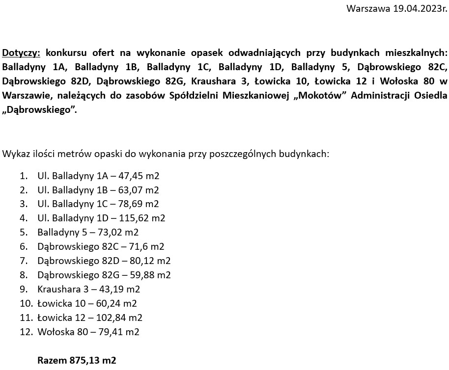 opasek odwadniających przy budynkach mieszkalnych Balladyny 1A, Balladyny 1B, Balladyny 1C,Balladyny 1D, Balladyny 5, Dąbrowskiego 82C, Dąbrowskiego 82D, Dąbrowskiego 82G, Kraushara 3, Łowicka 10, Łowicka 12, Wołoska 80 w Warszawie należących do zasobów Spółdzielni Mieszkaniowej „Mokotów” Administracji Osiedla „Dąbrowskiego”.